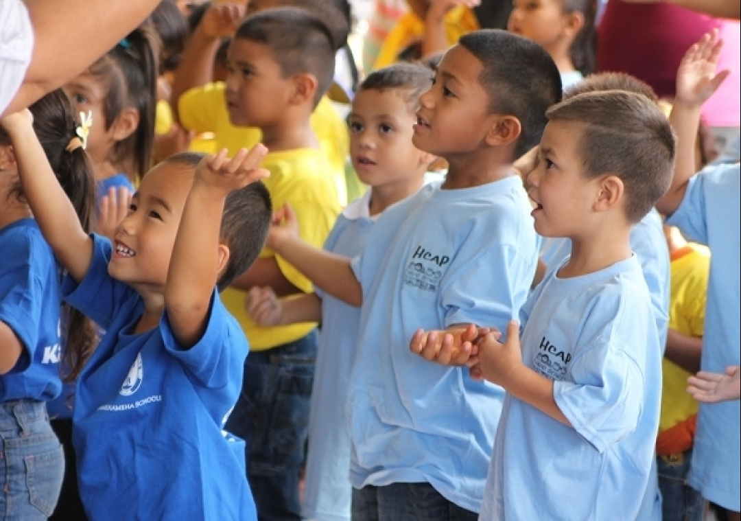 HHCAP-Head Start, PIDF-Ka Pa‘alana and KS preschool keiki sing “Eia Mākou, Pauahi Pauahi” for open house guests.