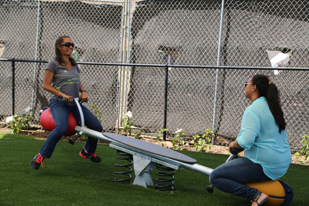 Andrea Dias and Jennifer Crawford have some fun testing out a seesaw in the Preschool Complex play area.