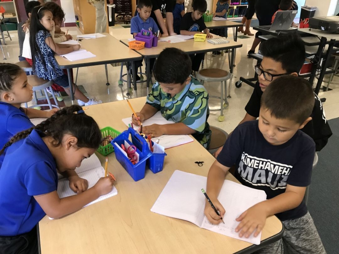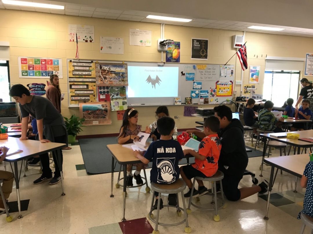 Kamehamemeha middle school students visited Kamehameha elementary school students in search of the infamous Kalani (Da Bat). MS haumāna shared an informative presentation on bat ecology with their protégés. Not only did ES haumāna learn about echolocation and threats to the bats, they also paired up with MS mentors and ventured outside in search of invisible bat markers on campus. The markers were made with hydrophobic paint that repelled water as the ground surrounding it got wet. The result was Kalani Da Batʻs signature revealing itself on the ground. Afterwards ES students conducted a reflection on all activities and the things they learned with their MS mentors.