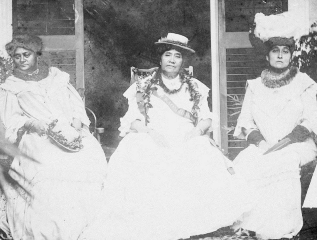 Queen Lili‘uokalani (center) wore a black sash, bearing the word Ka‘ōnohiokalā (the eye of the sun) as she watched a Kamehameha Day Parade from the lanai of Washington Place in 1906.