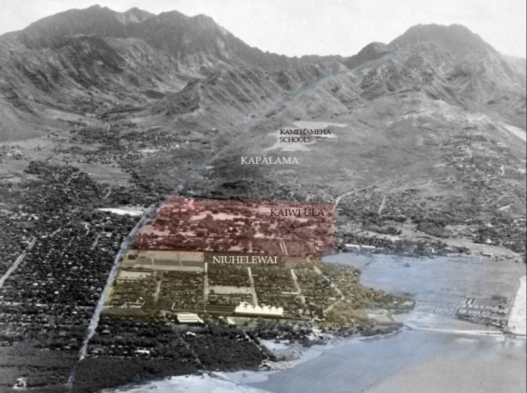 This overlay shows the approximate areas of Niuhelewai, Kaiwi‘ula and Kapālama in relation to the Kamehameha Schools Kapālama campus. After the Battle of Nuʻuanu, Kamehameha and his warriors restored these areas by building and maintaining loʻi kalo and loko iʻa.