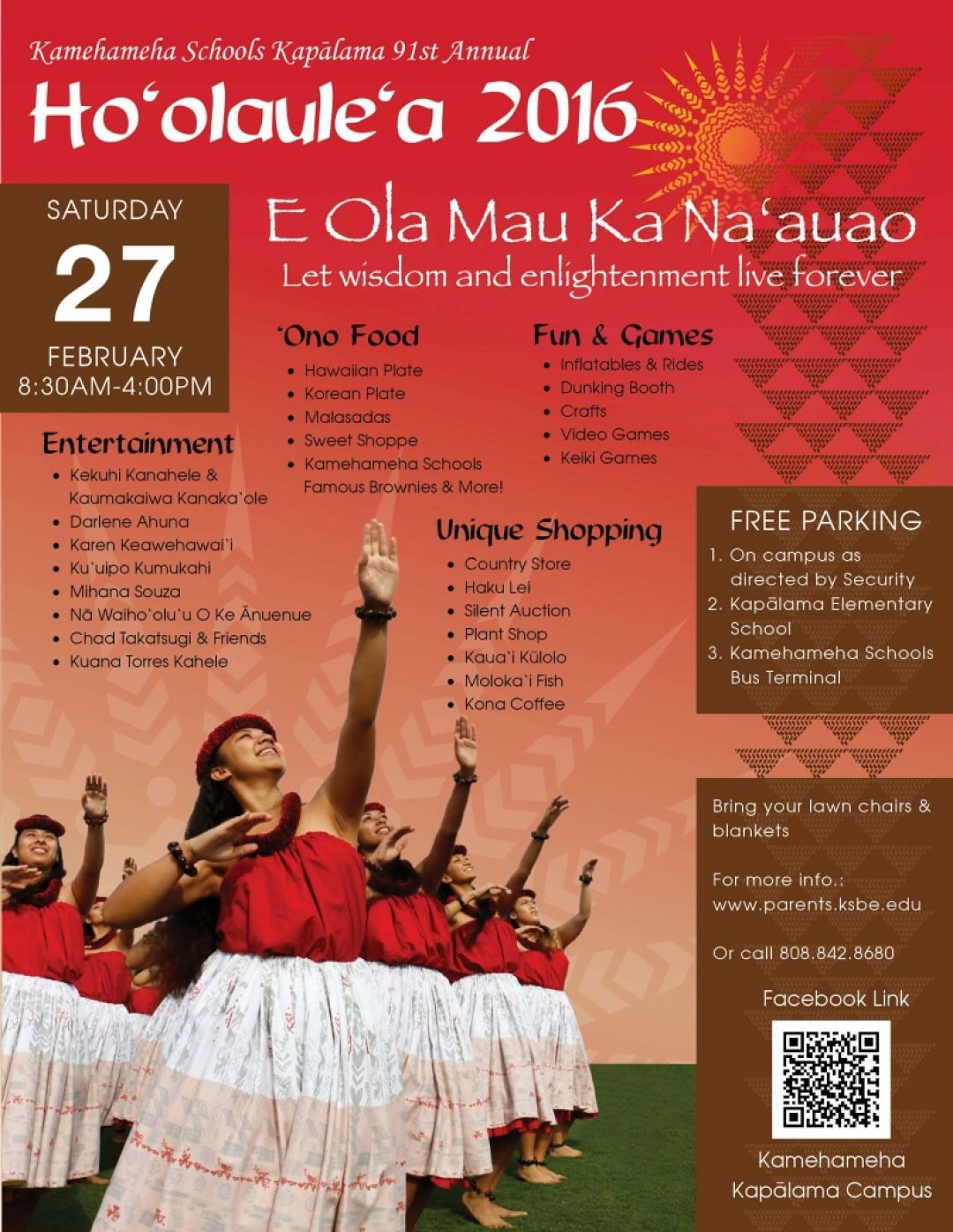 The 91st Annual Ho‘olaule‘a at Kamehameha Schools Kapālama is a family-friendly, cultural celebration slated for Saturday, Feb. 27, from 8:30-4:00 p.m. It is free and open to the public with parking on campus as directed by security, at Kapālama Elementary School and at the Kamehameha Schools bus terminal. Bus shuttles begin at 7:00 a.m.