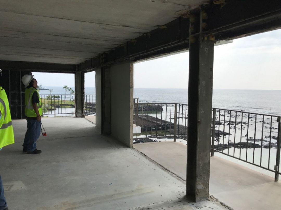 Workers inspect the interior of the gutted Keauhou Beach Hotel.