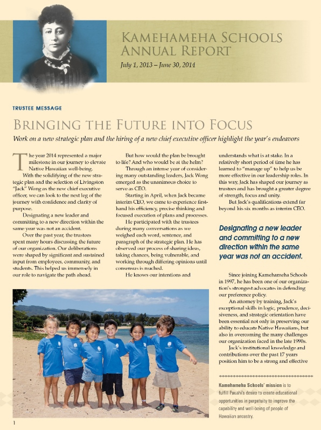 Kamehameha Schools continues to make significant strides toward achieving its educational mission, according to the trust’s newly released Fiscal Year 2014 Annual Report produced by KS’ Community Relations and Communications Group.