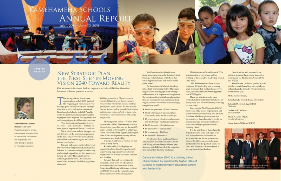 The annual report was produced by KS’ Communications Group led by Vice President Kevin Cockett. The creation of the report was a kākou effort, as are most Kamehameha Schools projects.