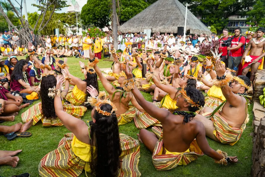 The landfall ceremony in Papeʻete,Tahiti, was epic in scale and resembled very closely the sequence of events in Taputapuātea. It was extraordinary to witness the level of cultural expression and protocol in the center of French Polynesia’s governance and commerce. The waʻa landed at Hōkūleʻa Beach, a site that was renamed to honor the location of the historic 1976 landfall. From there, crew and students made their way to the Hōkūleʻa Monument at Pāʻōfaʻi Gardens. “As we welcomed the ʻohana waʻa to shore, all I could think of was the multitude of people there to welcome them, and the many hands that went into creating such a celebration,” said Huali Hudgens KSK’25. “In order to ʻauamo our kuleana, like the generations before us, we must participate in these hands-on experiences that Kamehameha Schools provides.”