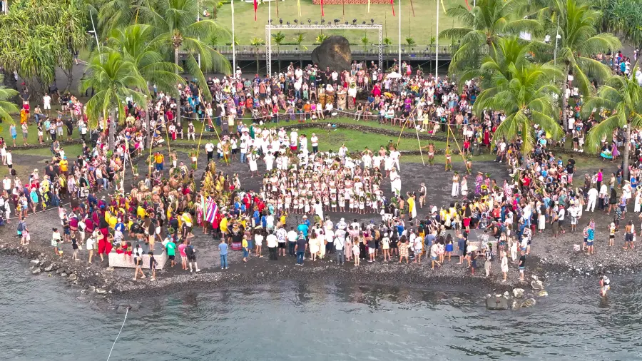 In June 2025, Hōkūleʻa’s arrival in Raʻiātea marked the first time she had traveled along the ancestral pathway Kealaikahiki directly to the sacred site of Marae Taputapuātea. Thirteen students and recent graduates from the Kapālama campus formed the backbone of the Kamehameha Tahiti delegation. With each element of the ceremony carefully shaped, Kamehameha’s kuleana was to help prepare and guide the leadership and crews of Hōkūleʻa and Hikianalia upon landfall. At Taputapuātea, the crews disembarked and stood in waist-deep water near the shore. A pū was sounded, signaling the start of “A Honua,” a mele kāhea seeking permission to enter a new space. It was followed by “Pule Hoʻomaikaʻi no ka Waʻa” which places a cloak of protection on all who are gathered. “Auē, Ua Hiti Ē!” is an exuberant expression of joy for safe landfall.