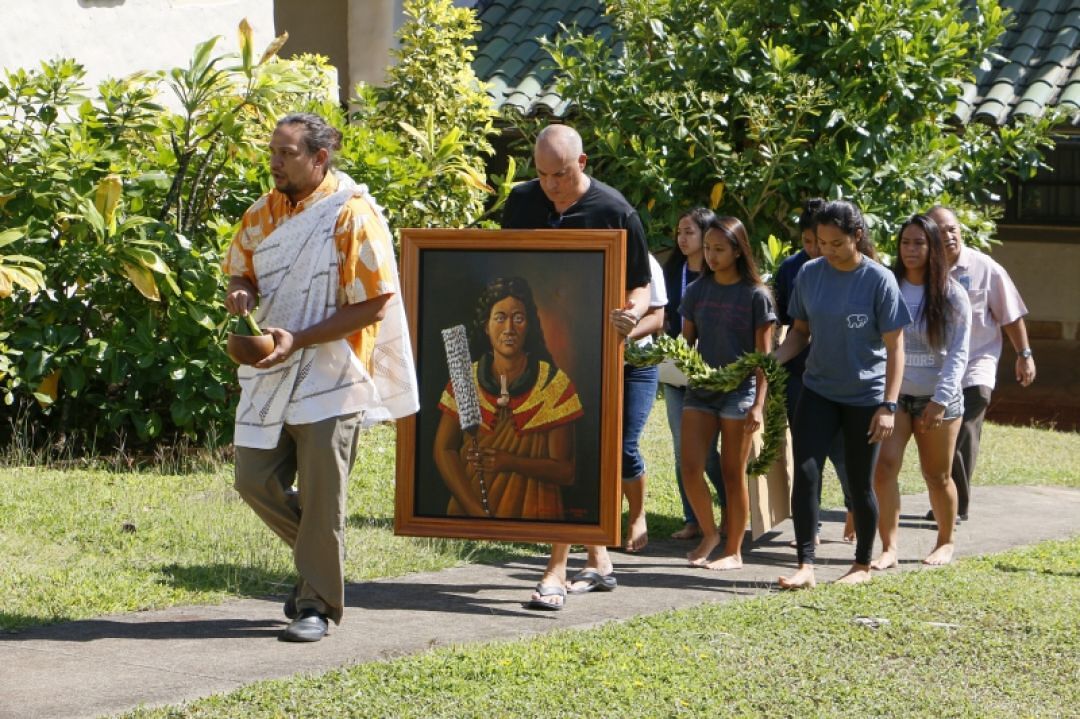 Ho‘okahua Cultural Specialist Laiana Wong-Kanoa leads Parker and the girls of Kapi‘olani Nui as they take the portrait to its new home.