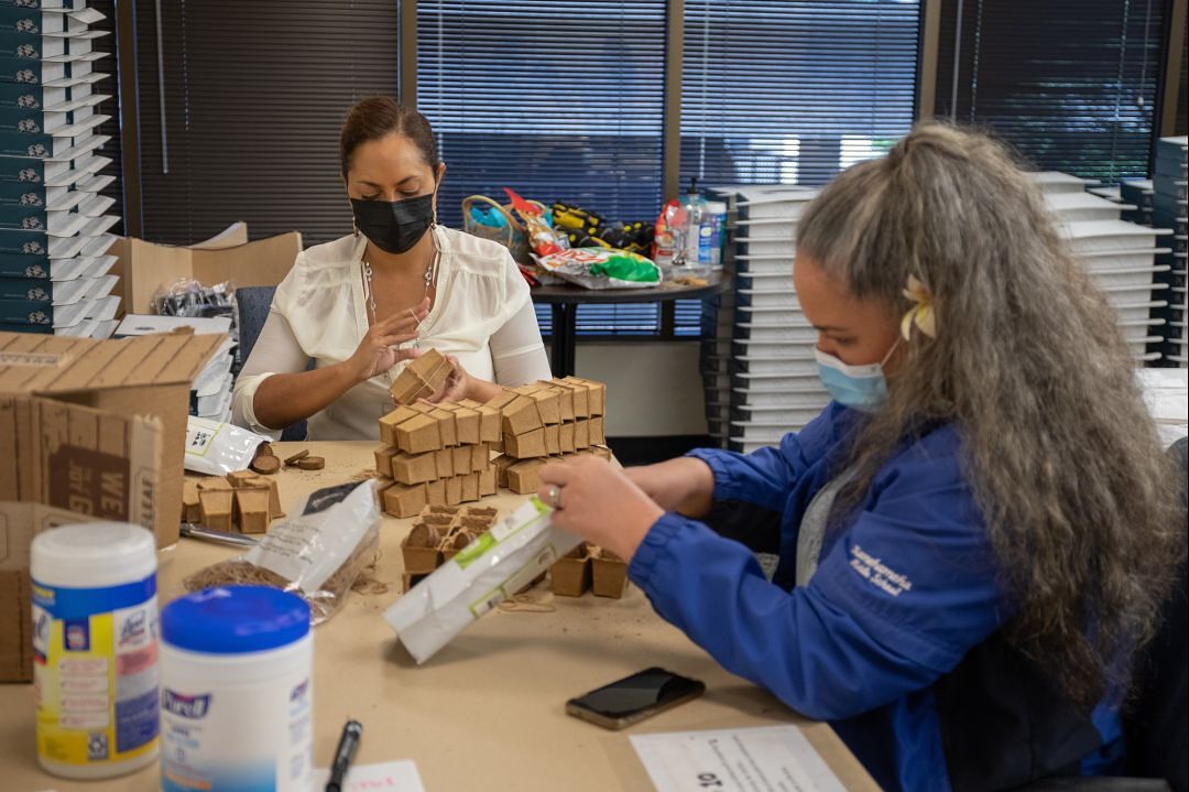 Creating the kits was a kākou effort. Watch Kealaiwikuamoʻo and KS employee volunteers as they compile Kaulu Kits on one of five assembly days. Look closely and you’ll see KS CEO Jack Wong and his team helping with everything from bundling books to prepping pots for ʻa‘ali‘i seeds.