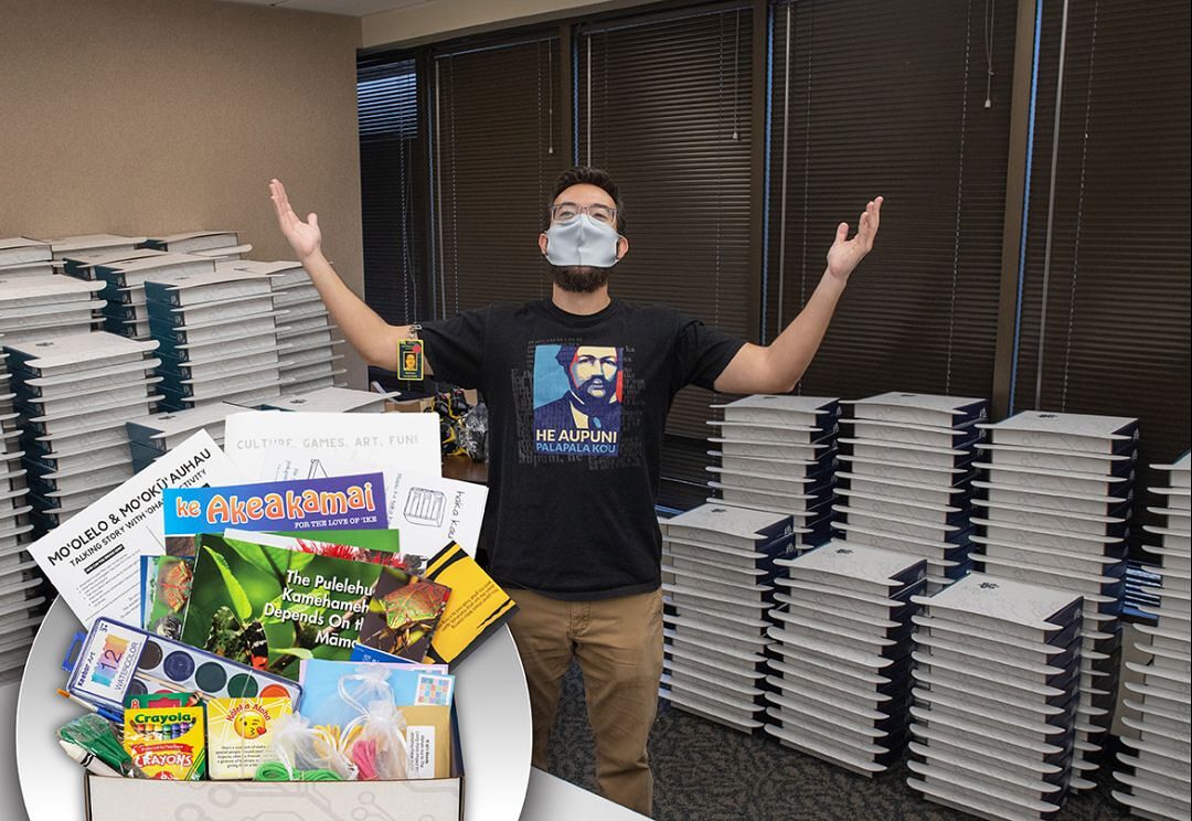 Network Engagement Solutions Engineer Maui Bartlett celebrates the completion of 1,000 Kaulu Kits that were mailed to families during fall break.