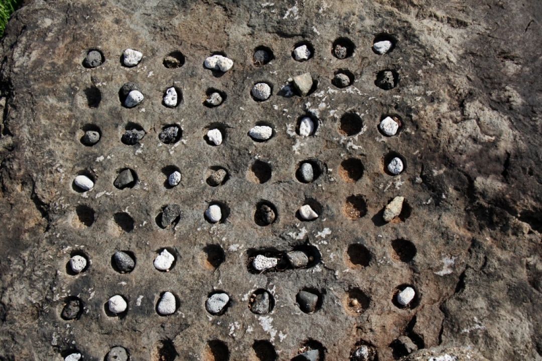 Kōnane is played on a papa mū (stone board) with shallow holes set in rows and columns. Black and white ʻiliʻili (small stones) are used as playing pieces to jump over an opponent’s pieces to remove them from play.