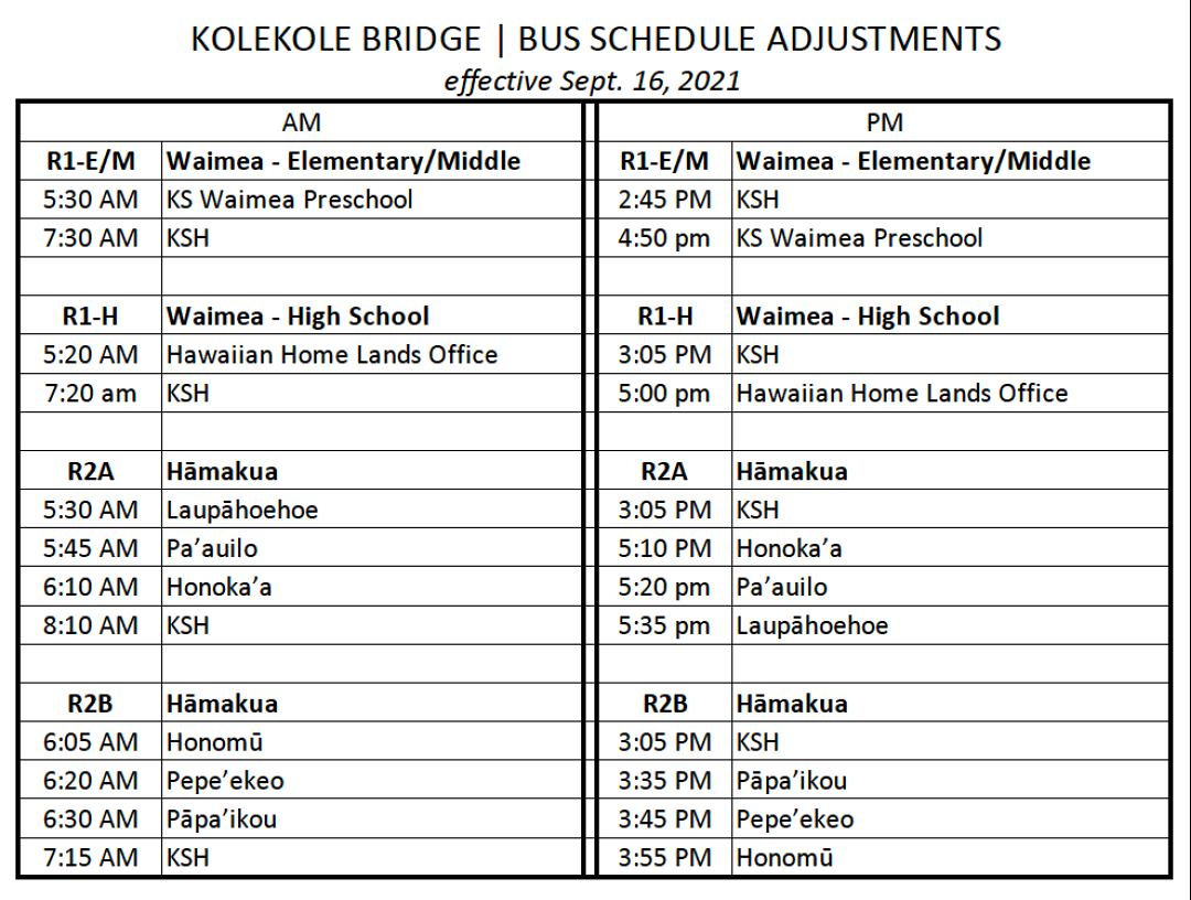 We understand that the time changes will be an adjustment for all of us. If after seeing the schedule, you need to adjust your needs for bus service or would need to adjust the stop for pick-up and drop-off of your keiki, please contact our transportation coordinator, Ray Iyo, at raiyo@ksbe.edu to see if or how we can accommodate your ʻohana. There are limitations with bus seating and COVID-19 protocols we have in place, so we ask for your patience and understanding as we navigate this new challenge together.