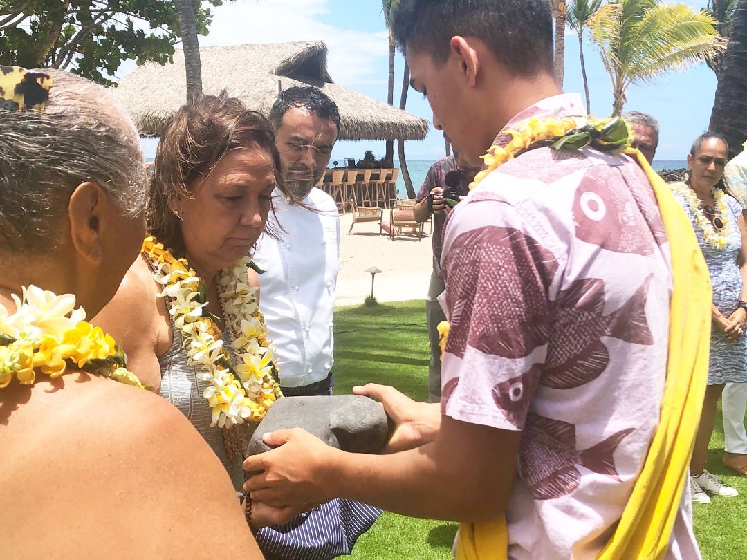During Kona Village's 'Aha Lei Piko ceremony, Trustee Crystal Rose holds a pōhaku from Kahuwai Bay that fronts the newly reopened resort. A Hawai'i Island native, Trustee Rose joked that when she first saw the remote resort as a little girl, she thought it was 'Gilligan's Island,' the television comedy from the 1960s about stranded castaways on a deserted island.