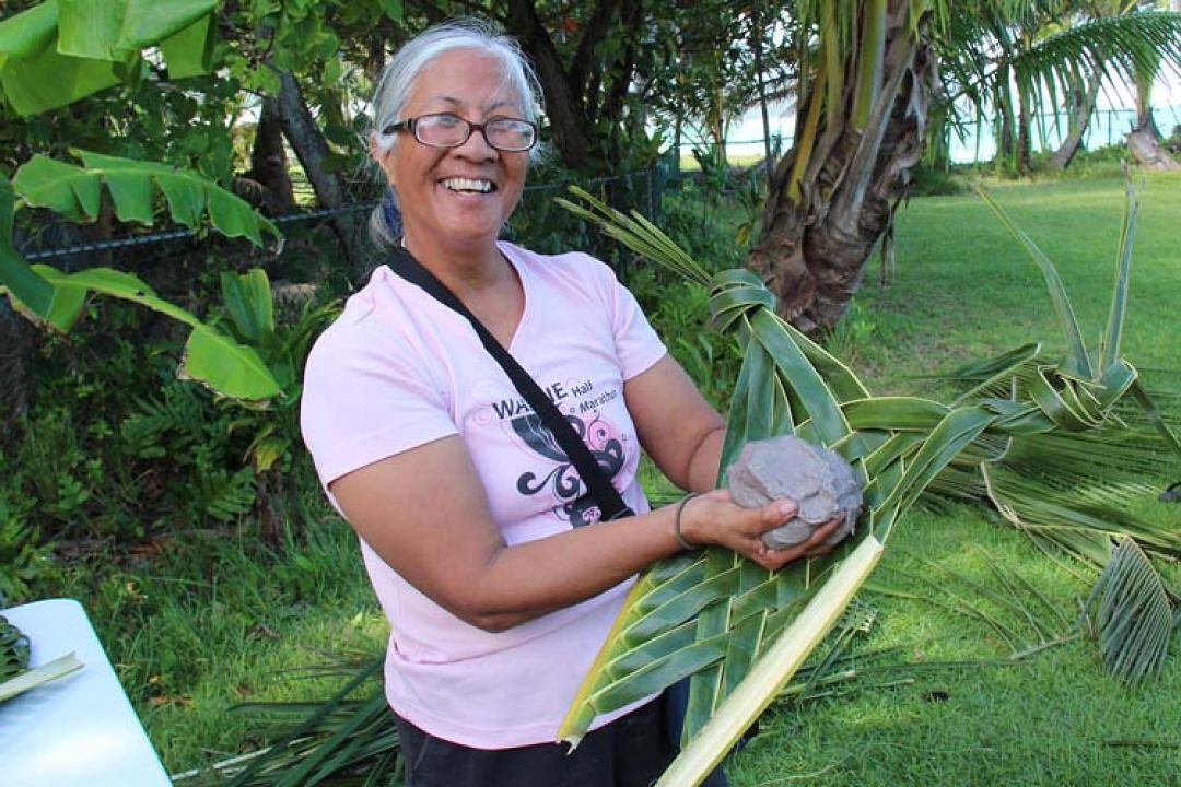 Alumna Frances Dinnan shows off the lauhala plate and paʻiʻai she made during the huakaʻi. Read her personal account of the experience below.