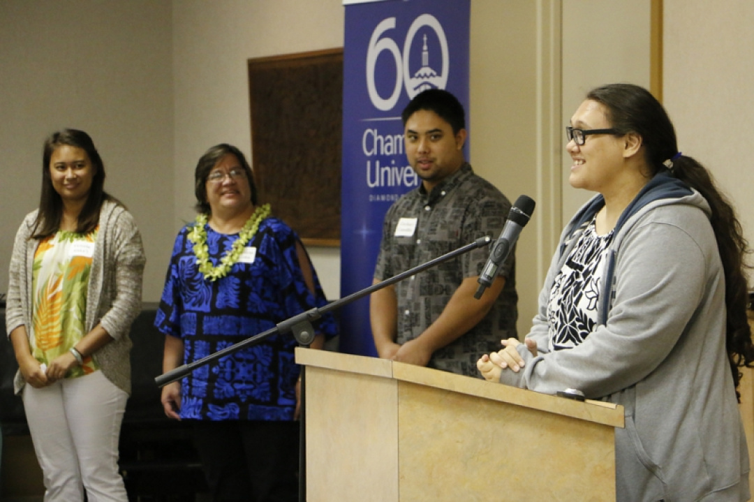 Chaminade biology major and KS scholarship recipient Hulali Kinilau and classmates (L-R) Victoria Alakaʻi, Sharmayne Kamaka, and Zachary Consillio shared their career goals at the signing event.