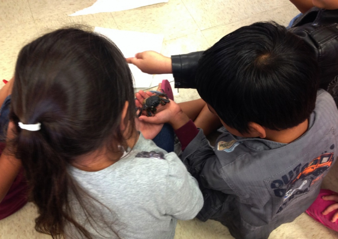 Keonepoko Elementary School keiki examine the shell of an ‘a‘ama crab during Lā Le‘ale‘a – Fun Day.