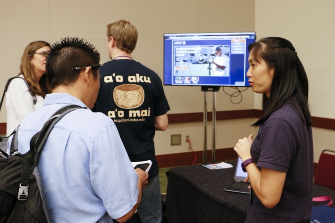 KS Hawaiʻi students Tia Kamaliʻi, Jarvis Benito and Carlie Baclig presented some of the projects done on their campus at the “Student Showcase” station, giving educators an idea of what student-produced digital media pieces, like KSH’s “Lehua TV,” could look like.