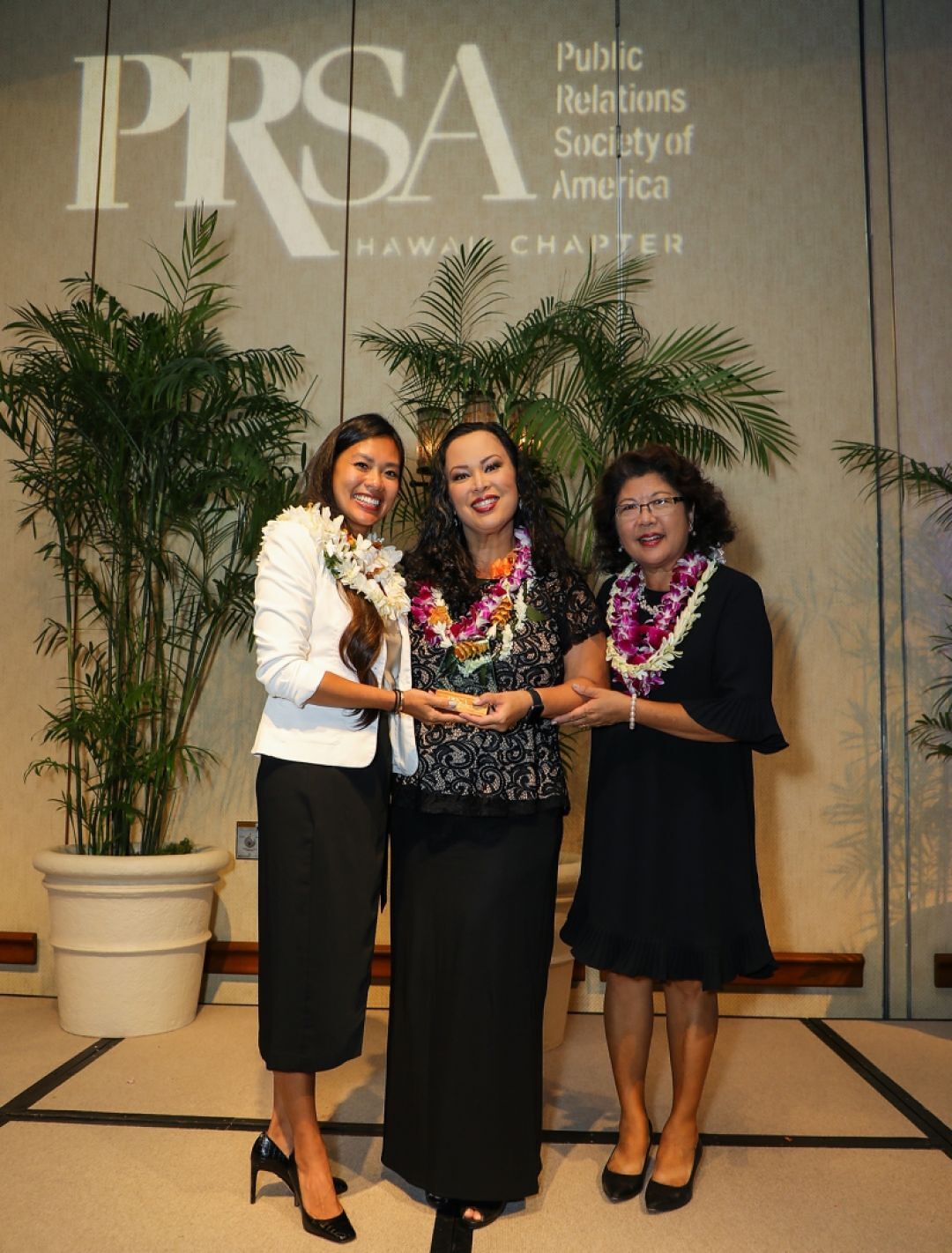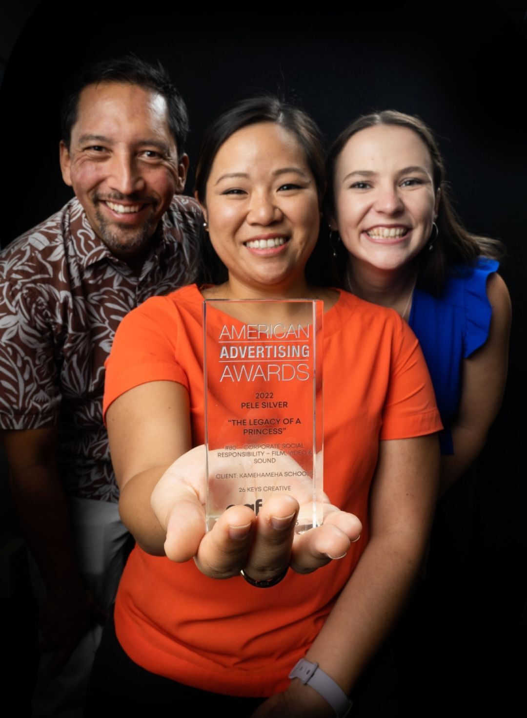Senior Multimedia Content Specialist Jacob Chinn, Marketing Manager Lindsey Chun-Hori KSK’04, and Marketing Specialist Jessie Coney KSH’15 pose with the Pele Award for, “The Legacy of Princess.” The trio lead internal production of the video with support from Marketing Director Andrea Kanno, and members of the Hoʻokahua Hawaiian Cultural Vibrancy and the Strategy and Transformation groups.