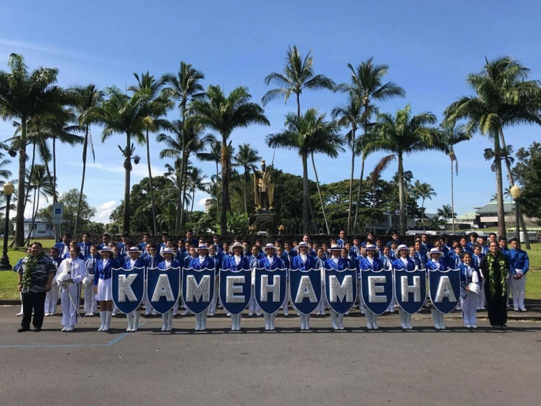 The KS Kapālama marching band under the direction of Band Kumu Matthew Urabe KSK’99 and Interim Assistant Band Director Jason Kaneakua KSK‘96 performed as part of the Merrie Monarch Royal Parade.