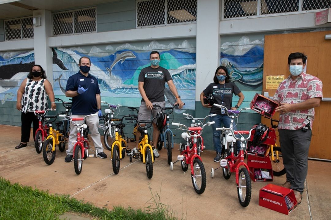 KS Leeward Oʻahu Regional Director Kalei Kailihiwa, Planning and Development Director Duff Janus, Investment Operations Director Euan Beer, Functional System and Financial Analyst Stephanie Tancayo, and Kamaile Academy Principal Paul Kepka line up with some of the 15 bikes and helmets donated to the Hawaiian-focused charter school.