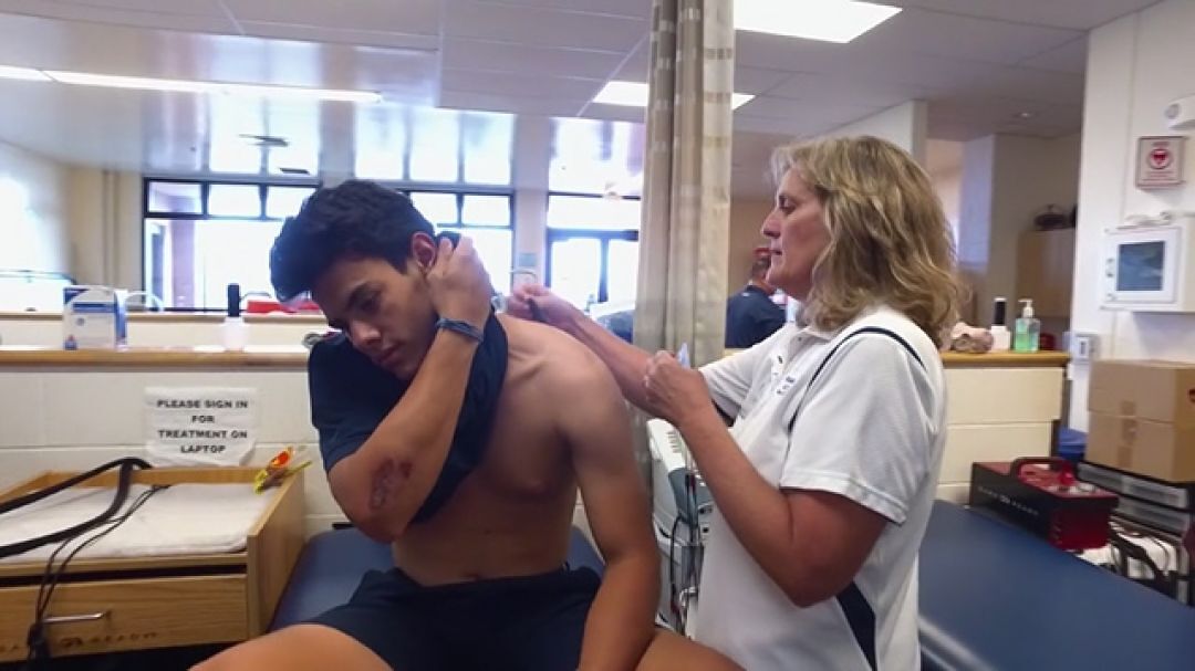 Manager Cindy Clivio demonstrates how the Athletic Healthcare team works to ensure the health of student-athletes across all KS campuses, and also encourages open communication between parents and students about injuries.