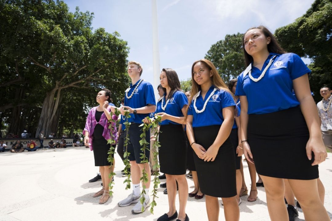 Nearly 30 Kamehameha Schools Kapālama High School po‘o kula student ambassadors dedicated a day of their summer vacation to help host the event. The haumāna presented a maile lei and oli as makana before the king’s statue. They also greeted and seated guests, presented lei to dignitaries and served lunch. KS alaka‘i attended the historical event as well.