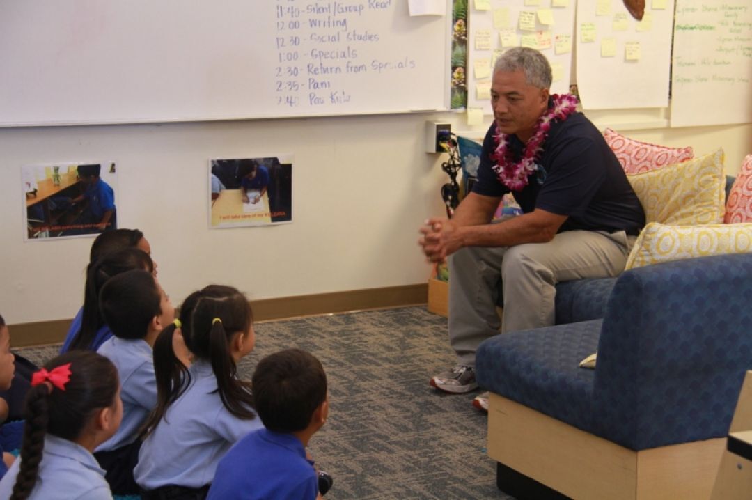 Before sharing his stories, Wong performed an oli kāhea (a chant requesting entry) and first grade students and their kumu Kaleo Kaleohano and Waianuhea Paleka replied with the school’s oli komo (a chant granting entry).