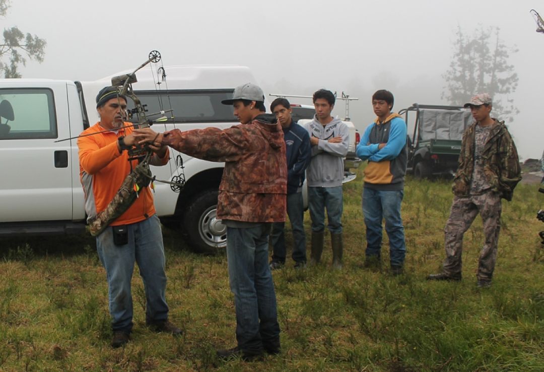 Earl Kalawaia, a volunteer with the Hawaiʻi Division of Forestry and Wildlife, held an archery demonstration for the haumāna. He also talked to them about safety, being responsible and having good hunting ethics.