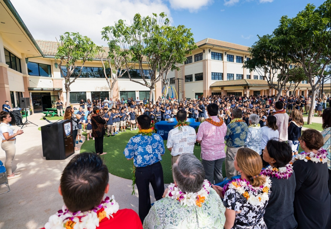 Kamehameha Schools and Island Pacific Academy celebrated the educational partnership at IPA’s Kapolei campus, beginning with a welcoming oli (chant).
