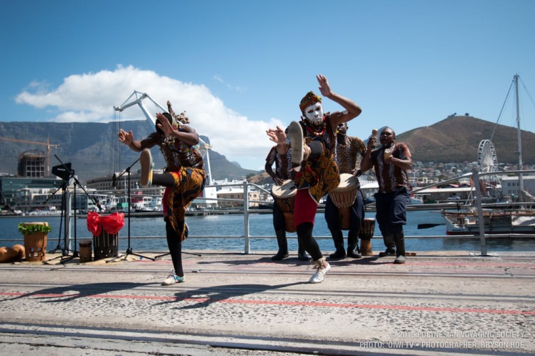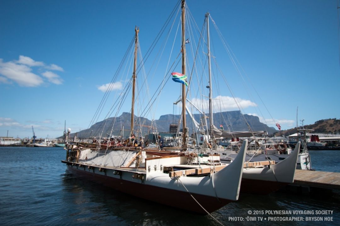 Hōkūle‘a docked in the Cape Town harbor on Nov. 12. The destination marks the midpoint of the canoe's worldwide journey.