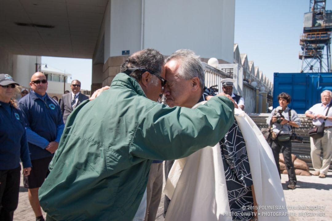 KS Executive Culture Officer Dr. Randie Fong and Hōkūle‘a crew member Kālepa Baybayan share a honi - a traditional Hawaiian greeting of respect.