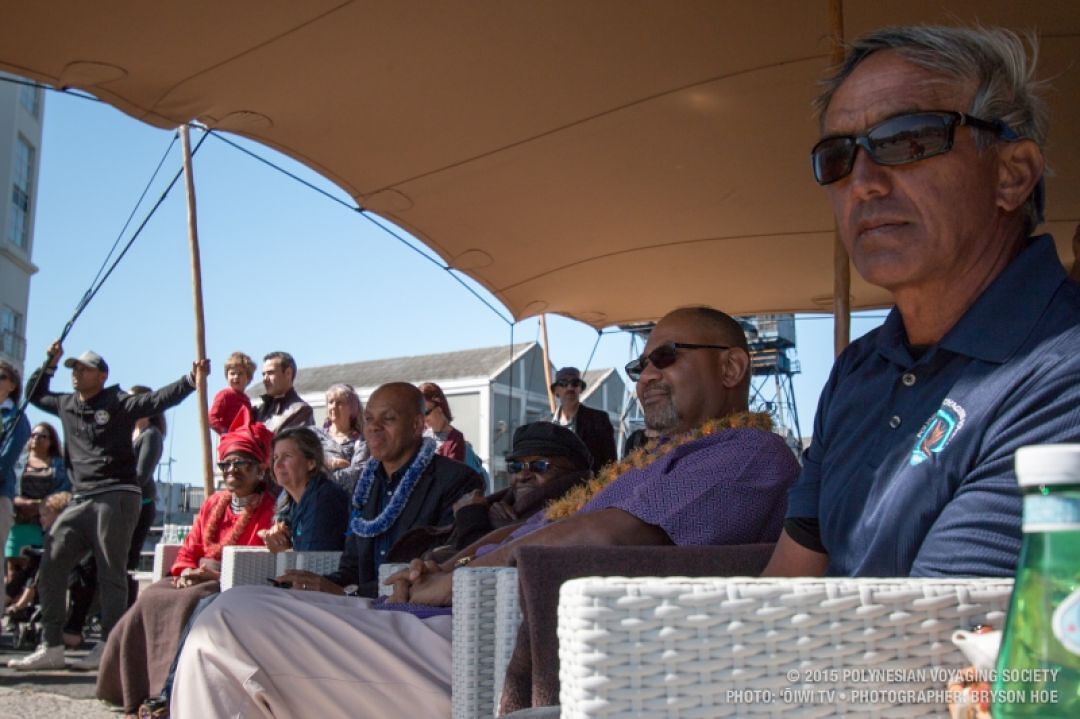 Master Navigator Nainoa Thompson (r), president of the Polynesian Voyaging Society, sits beside Archbishop Desmond Tutu (center) during the ceremony.