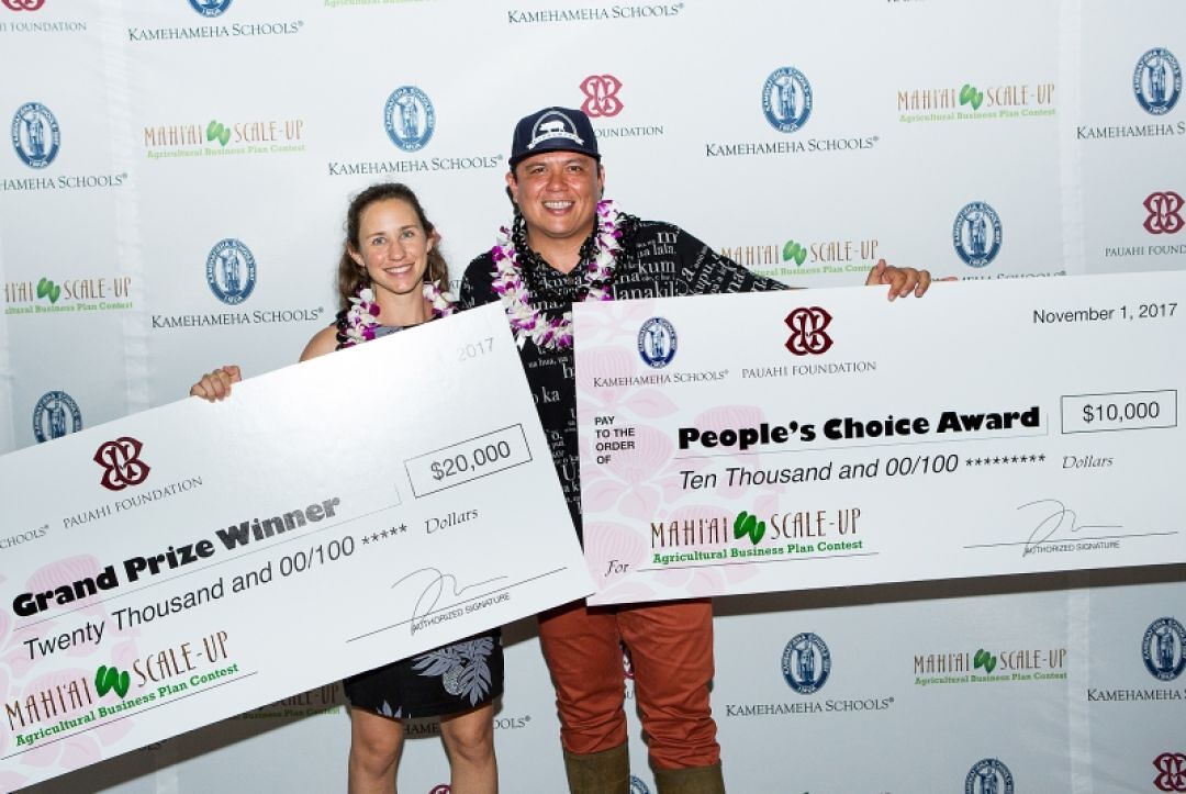 Mahi‘ai Scale-up aims to assist farmers and food distributors wanting to expand their operations like Dana Shapiro of Māla Kalu‘ulu, left, who won the $20,000 grand prize of the 2017 Mahi‘ai Scale-up and Brandon Lee of Kaunamano Farms who garnered the competition’s $10,000 People’s Choice Prize.