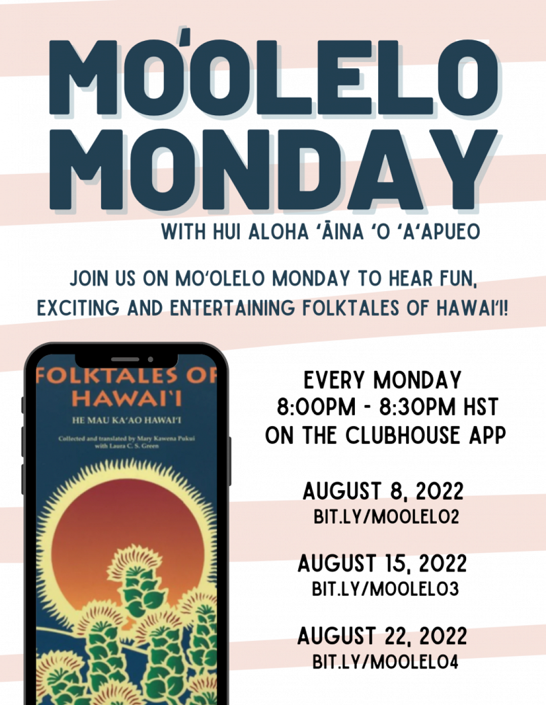 Each Moʻolelo Monday will feature three or four stories that run anywhere from five to 10 minutes. These would be live readings on the audio room app Clubhouse followed up with some casual kūkākūkā by the hui members.