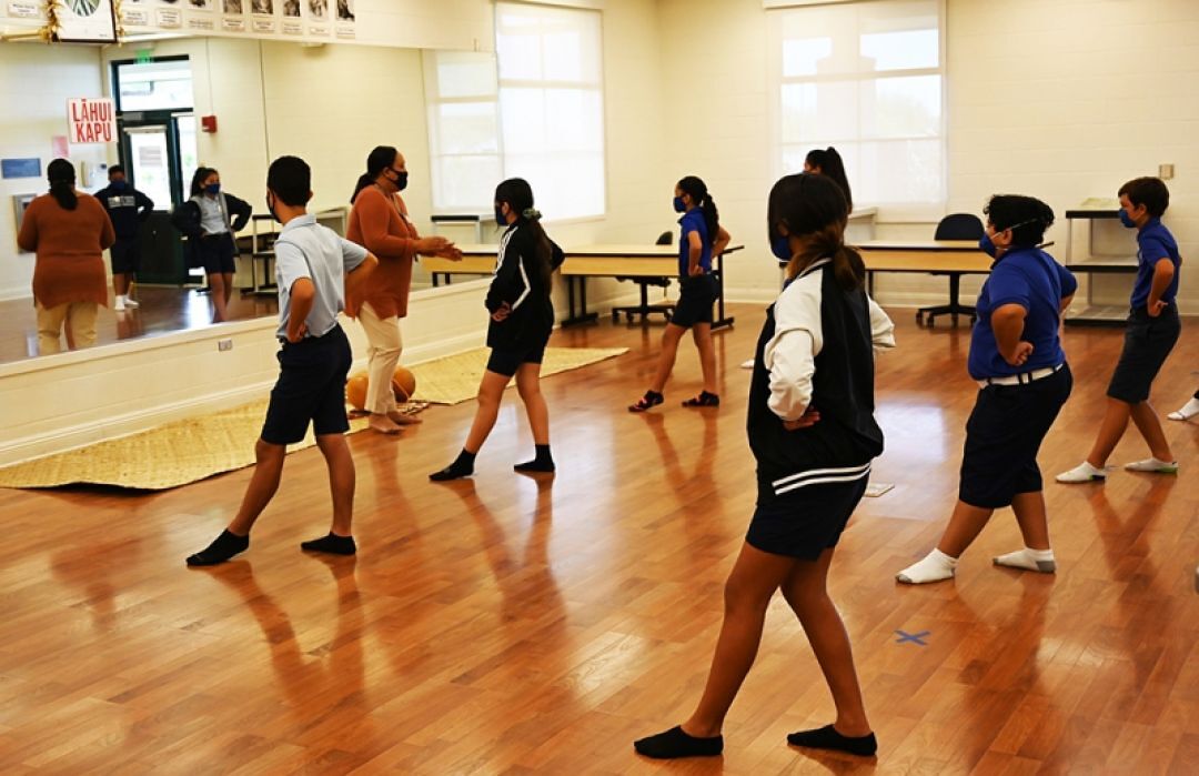 Kumu Nālani Hoewaʻa teaches a hula class of sixth graders while keeping them socially distanced. Sixth graders are split into two groups. While one group attends class on campus, the other group continues distance learning.