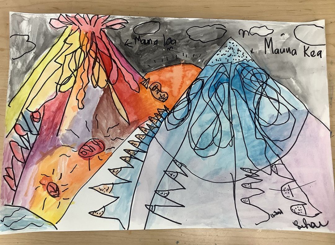 KSM Elementary School art students depicted the differences between Mauna Loa and Mauna Kea for a drawing assignment.