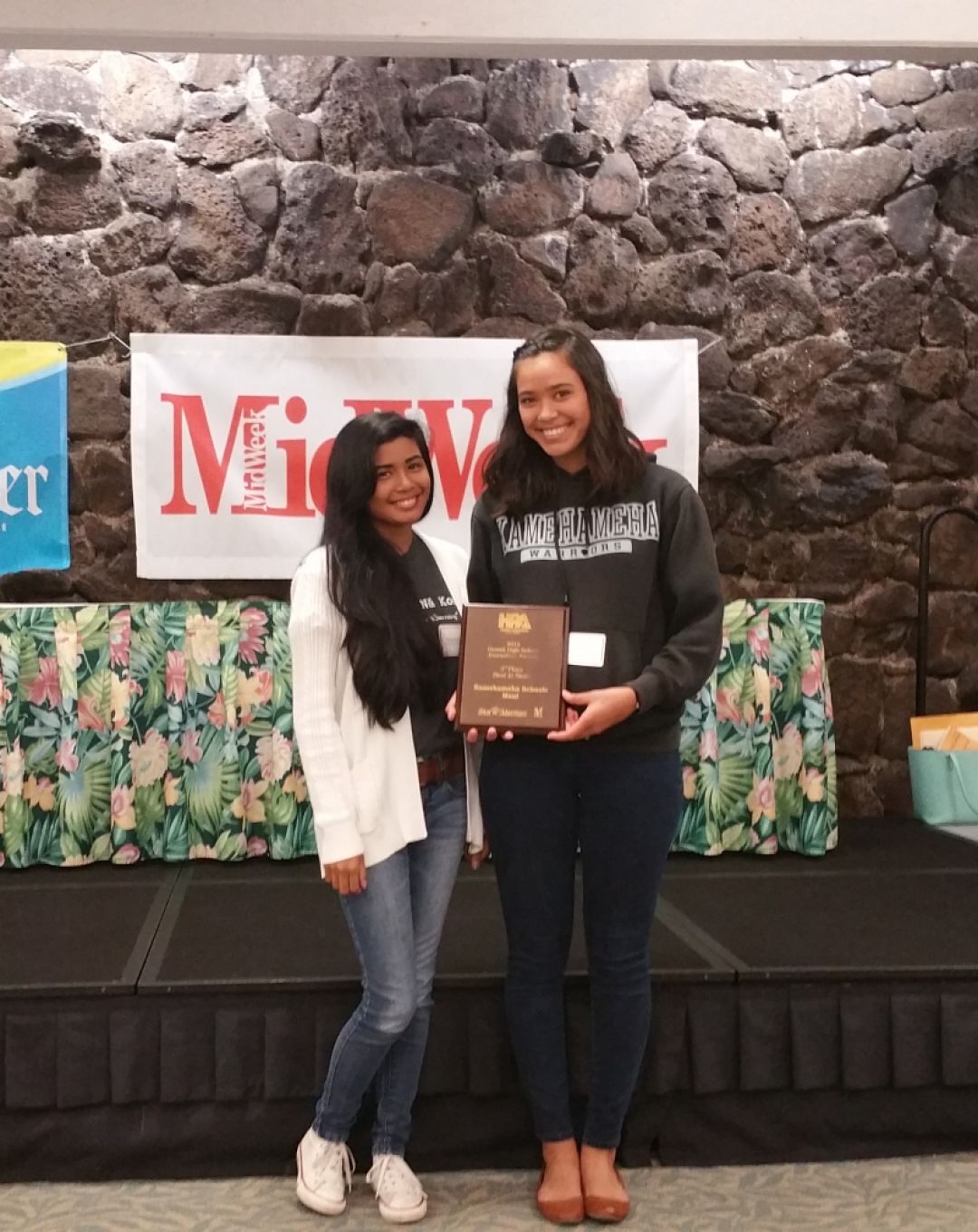 Features editor Destinee Murray and Maile Sur pose with their third place plaque at the HPA High School Journalism Awards.