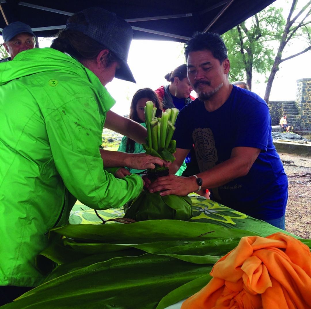 The Nature Conservancy's Sam ʻOhu Gon helps KS Natural Resources Manager Mili Browning prepare a hoʻokupu during a welcome gathering hosted by KS.