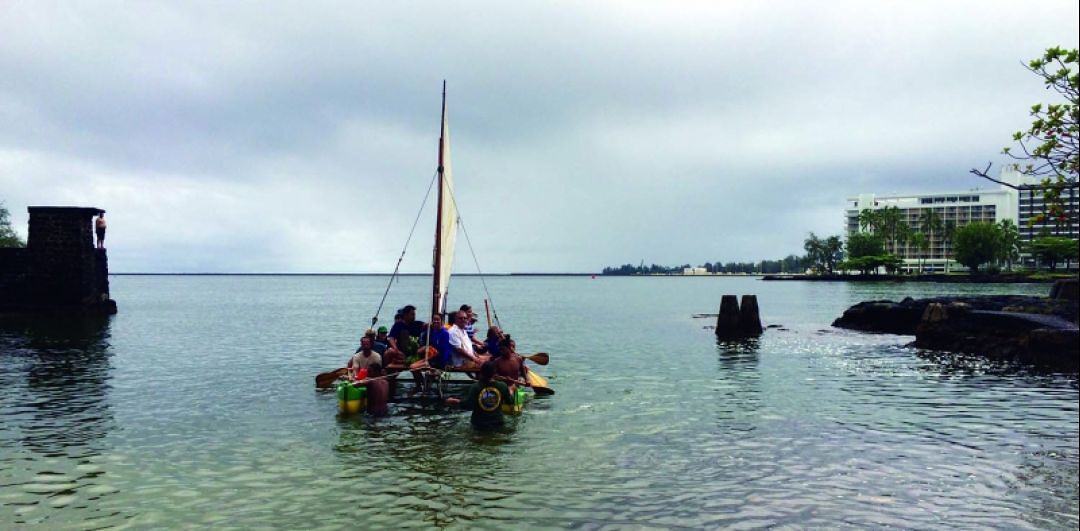 Ka ‘Umeke Kā‘eo charter school students transport conservation leaders into Hilo Bay on the Hiapo-te-Ariki-kai.