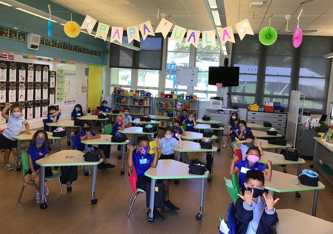 KSK KINDERGARTEN KUMU MARY PITTMAN – Beginning the school year face-to-face brought with it feelings of excitement, joy and anxiety at the same time. WHAT WE’RE UP TO – One of the haʻawina (lessons) we like to do in papa mālaaʻo (kindergarten) is reading the story, “The Kissing Hand” and talking about haumānaʻs feelings coming to “big kids’ school” here at KES. We also teach each keiki to mālama iā ʻoe iho (take care of yourself), e mālama kekahi i kekahi (take care of each other) and e mālama i kēia wahi (take care of this place) — helping to prepare our haumāna for kindergarten and beyond.