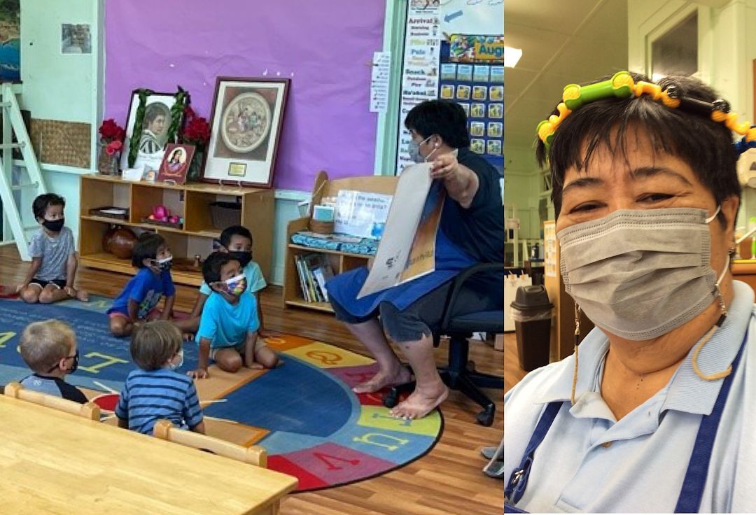 KS HANA PRESCHOOL KUMU CLAIRE “MOKI” NIHEU – One of the best things about in-person learning is that it provides opportunities for real student engagement. This morning, one of our keiki showed aloha by making a lei poʻo with manipulatives and placing it on my head. “For you kumu.” I thanked him and off he went. WHAT WE’RE UP TO – Right now, the keiki are learning how to listen when kumu and classmates are talking, how to pule before eating, and how to use their words to tell others how they feel or what they need help with.