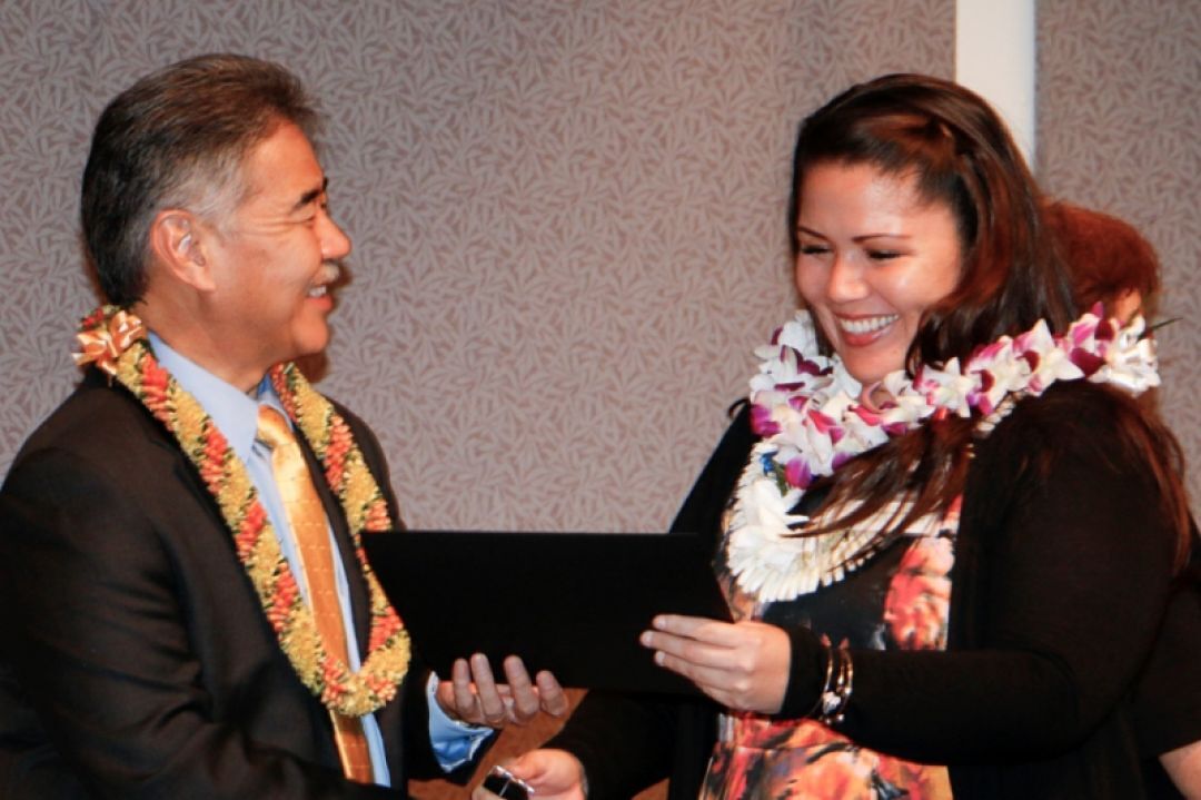 Governor David Ige presents an award certificate to certified teacher Kamaka Parker at the state capitol ceremony.