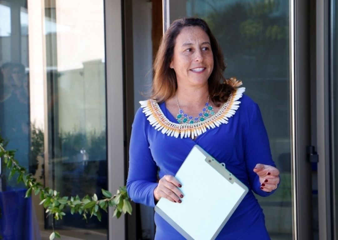 KS Area Development Director Catherine Camp thanks contractors and merchants at Kapalama Center during the blessing of the complex in January.