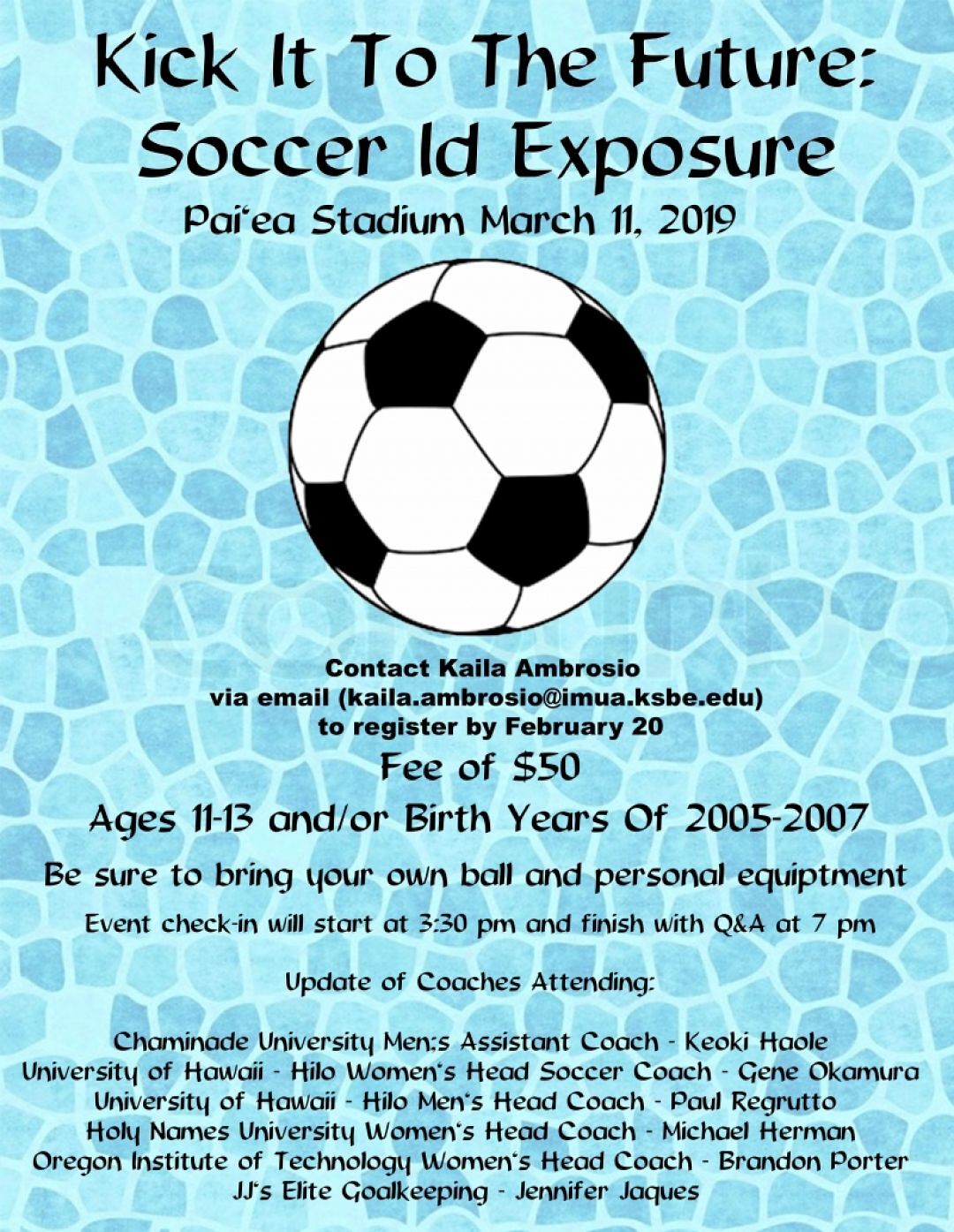 Check-in starts at 3:30 p.m. at Paiʻea Stadium and will end with a Q&A at 7 p.m. Athletes should bring a ball and their own personal equipment. The event is open for middle school students born between 2005 and 2007. Interested athletes should register for the camp by emailing Kaila at Kaila.ambrosio@imua.ksbe.edu. The cost for the camp is $50 and participants should register by Feb. 20.