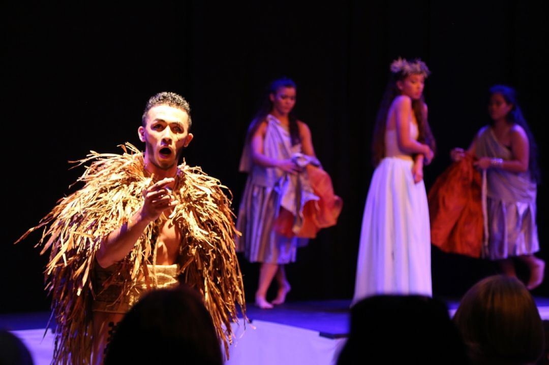 Kapepeʻekauila, played by senior Daylan Kalaʻi, gazes upon Hina and prepares to kidnap her to broker a peace for Hāʻupu.
