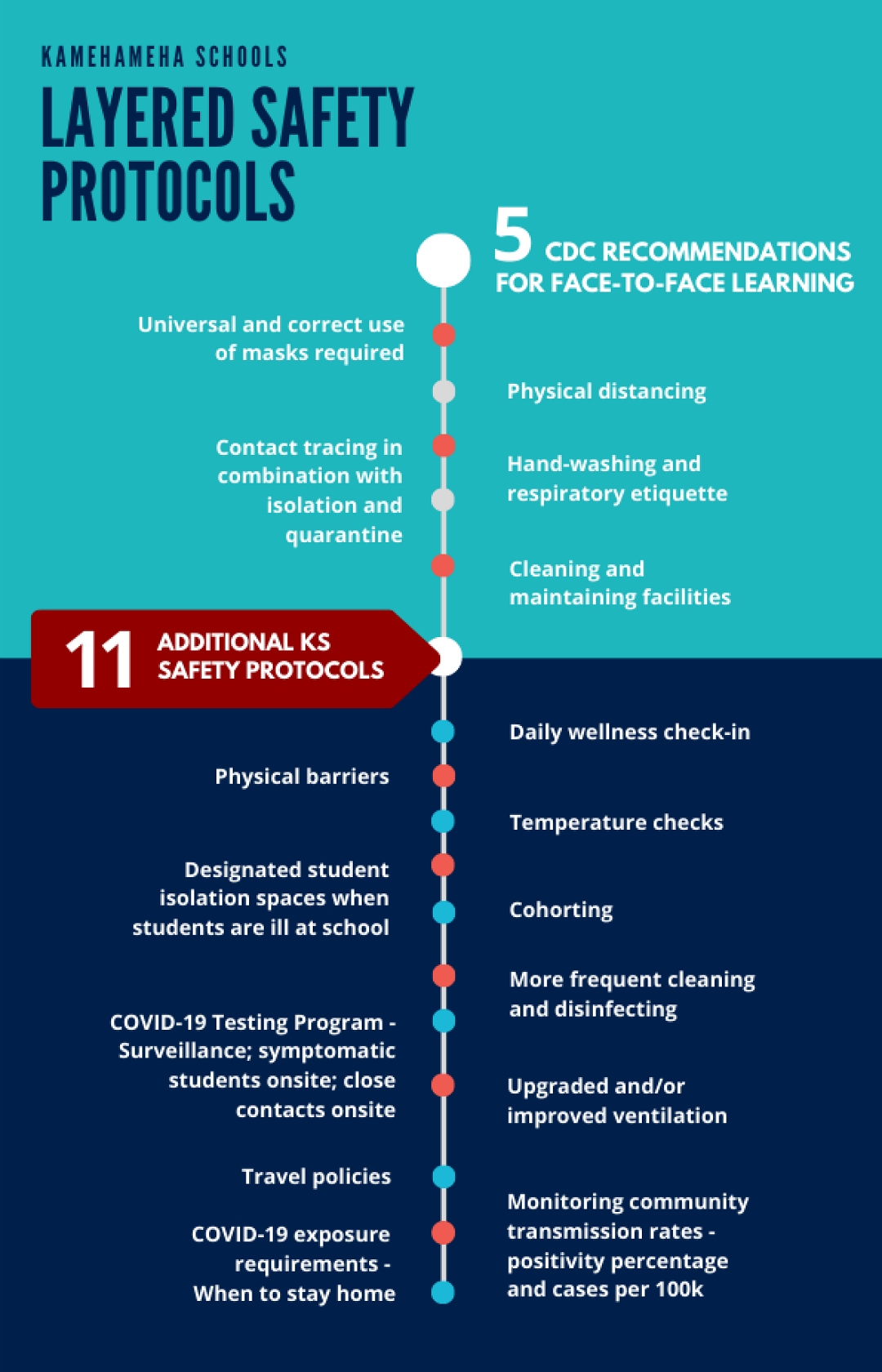 Since the start of the pandemic, Kamehameha Schools has researched and established multiple safety protocols layered one upon another that allow us to continue to evolve our hybrid learning model responsibly. Examples include adding on daily wellness check-ins, our travel policy, and most recently our testing program. All of these layers coupled with the experiences of bringing students back gradually since October, inform and assist us with how we can move forward safely.