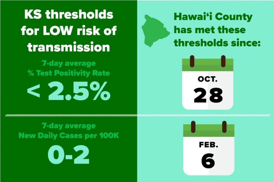 Since Feb. 6, Hawaiʻi County has met both of the KS thresholds established for the lowest risk of transmission.