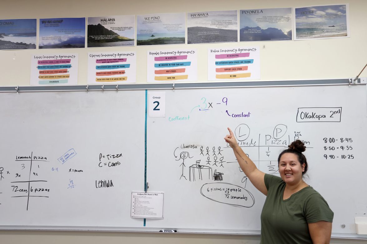 The whiteboard in Kumu Sydney Kealanahele’s eighth grade math classroom is covered in formulas and terms like “constant” and “coefficient” - typical lessons for beginning algebra. But look more closely, and above the board are lists with the heading “Community Agreements.” Those contain words like “collaborate;” “support each other;” and “be creative in your own way.” Typically not the concepts usually associated with math class. It’s one of the differences between traditional math and ethnomathematics - a developing field in which Kumu Kealanahele received certification last year.