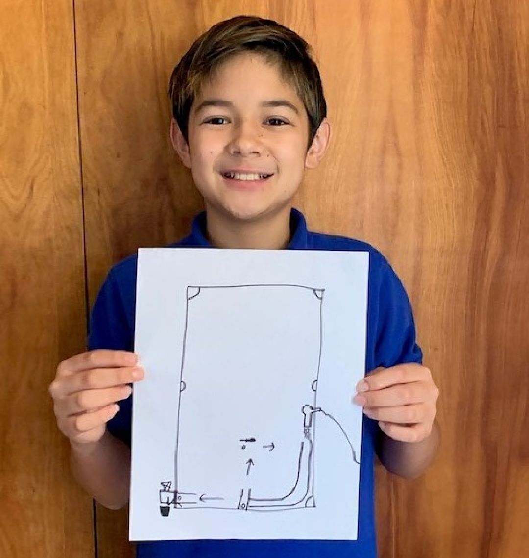 Kalama drew a blueprint for his Rube Goldberg machine that he created for a science assignment on energy transfer.