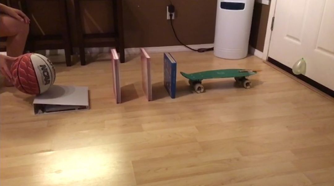The ball passed under the cardboard ramp and rolled through a hole cut in a tissue box before dropping into a cup placed on the floor. In order to accomplish the task, Kalama kept making adjustments after several unsuccessful attempts.
